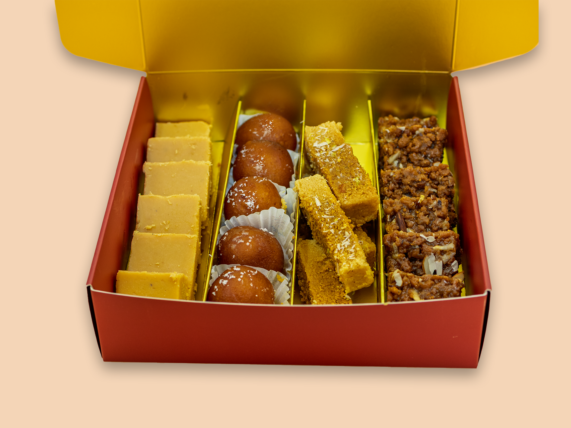 Heritage Box 1 brings together four timeless sweets that have been enjoyed for generations. The Khoya Barfi offers creamy richness, while Gulab Jamun delivers soft, syrup-soaked indulgence. Dodha adds a rustic, caramelized depth with its grainy texture, perfectly balanced by the smooth and traditional Milkcake.